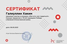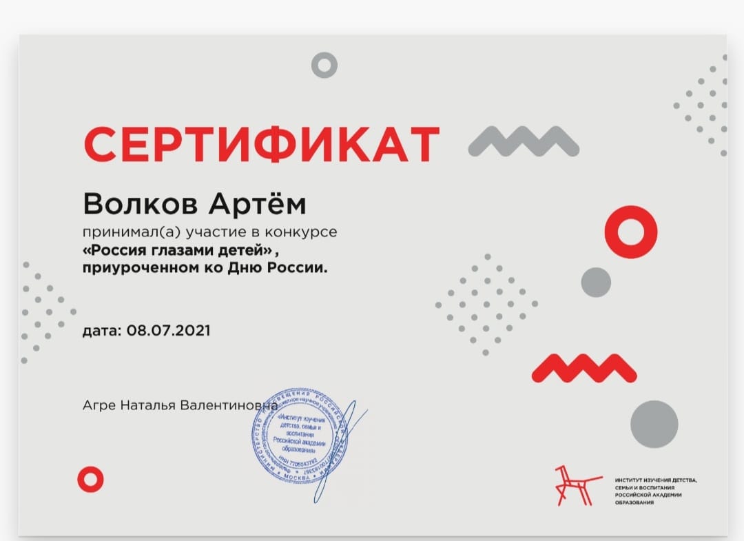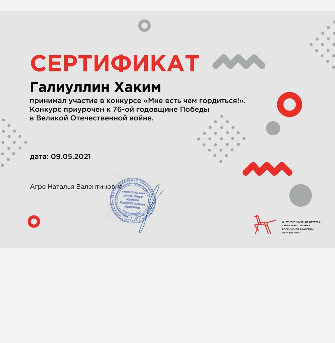 Благодарим за участие в конкурсе "Мне есть чем гордиться!", приуроченном к 76-ой годовщине Победы в Великой Отечественной войне. Конкурс организован ФГБНУ «Институт изучения детства, семьи и воспитания Российской академии образования».
