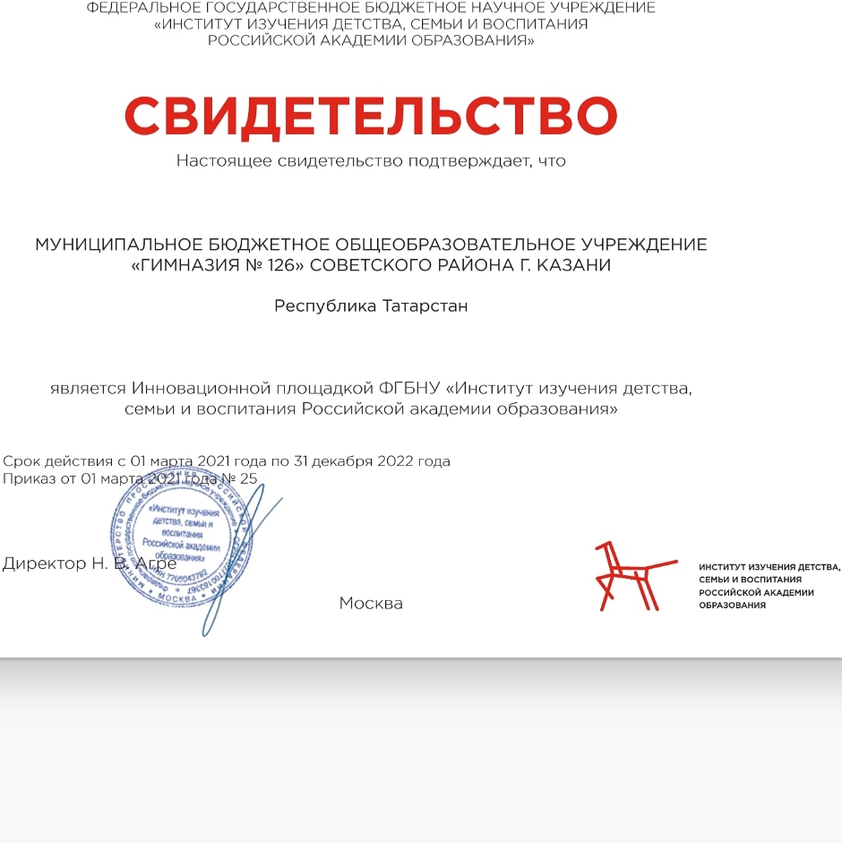Наша Гимназия получила сертификат. Мы являемся Инновационной площадкой ФГБНУ"Институт изучения детства, семьи и воспитания Российской академии образования".