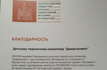 Творческая студия "Дивертисмент" получила благодарность от Центрального совета ВООПИК РФ за работу в проекте "Наследие в юном сердце".