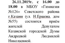 26.11.2019г. с 16.00 до 18.00 в МБОУ «Гимназия №126» Советского района г.Казани (ул. Н.Ершова, дом №55) состоится приём жителей Депутатом Казанской городской Думы Андреевой Людмилой Николаевной.