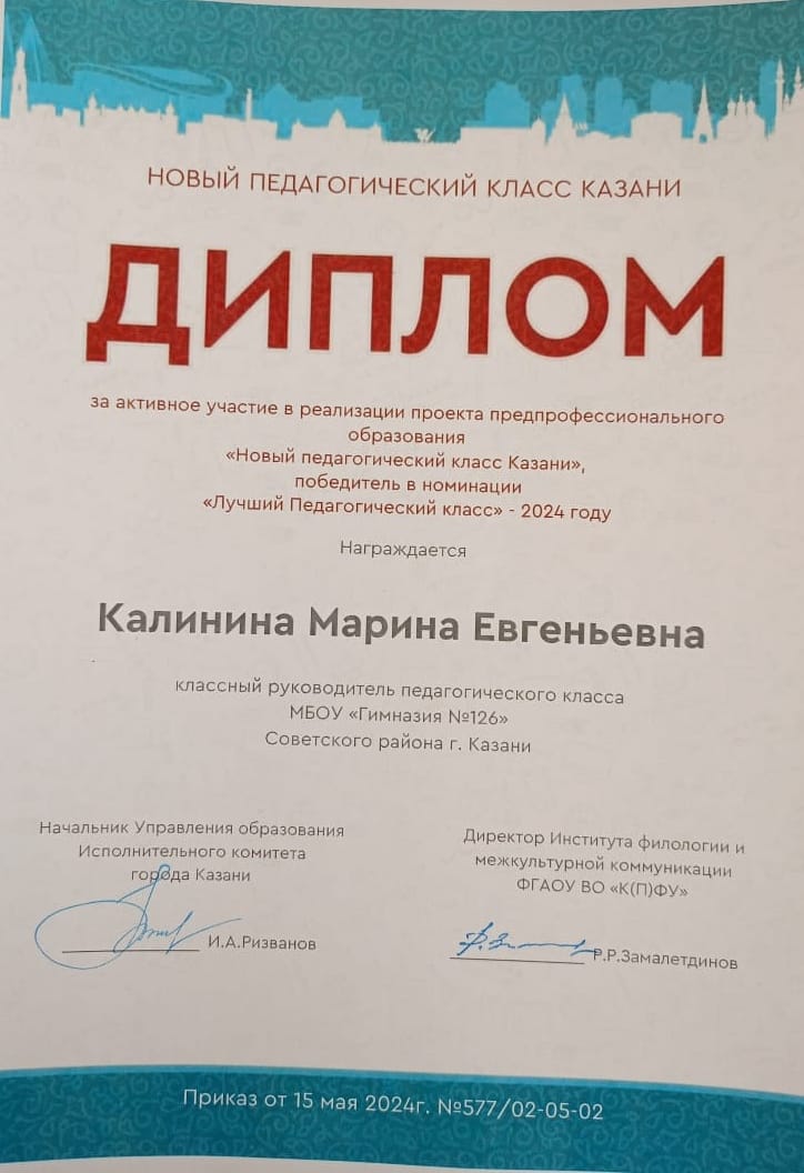 Были подведены итоги Казанской педагогической Олимпиады, определены лучшие в номинациях "Лучший ученик педагогического класса", " Лучший педагогический класс". Подведены итоги Казанской педагогической олимпиады учащихся классов психолого-педагогической направленности. Поздравляем обучающихся 10А класса, победителем стала Ахатова Камилла. Призёры, учащиеся 10 А класса Саттарова Ева, Тимофеева Арина.