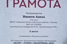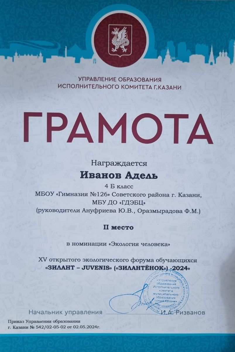 Поздравляем ученика 4Б класса Иванова Аделя с победой! II место в экологическом форуме "ЗИЛАНТ-JUVENIS- 2024. Благодарим за подготовку педагогов Оразмырадову Флюру Мухтаровну и Ануфриеву Юлию Владимировну. Желаем дальнейших успехов и творческих побед.