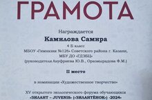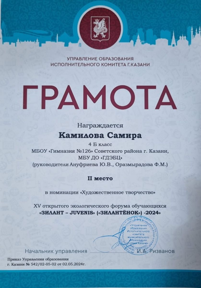 Поздравляем ученицу 4Б класса Камилову Самиру с победой! II место в экологическом форуме "ЗИЛАНТ-JUVENIS- 2024". Благодарим за подготовку педагогов Оразмырадову Флюру Мухтаровну и Ануфриеву Юлию Владимировну. Желаем дальнейших успехов и творческих побед.
