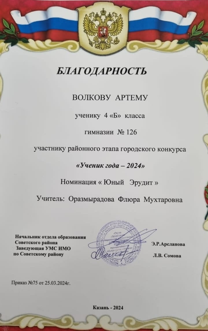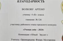 Поздравляем ученика 4Б класса Волкова Артёма. Он участник районного этапа городского конкурса "УЧЕНИК ГОДА-2024" в номинации "Юный Эрудит". Благодарим за подготовку учителя начальных классов Оразмырадову Флюру Мухтаровну. Желаем дальнейших успехов, новых достижений и побед.