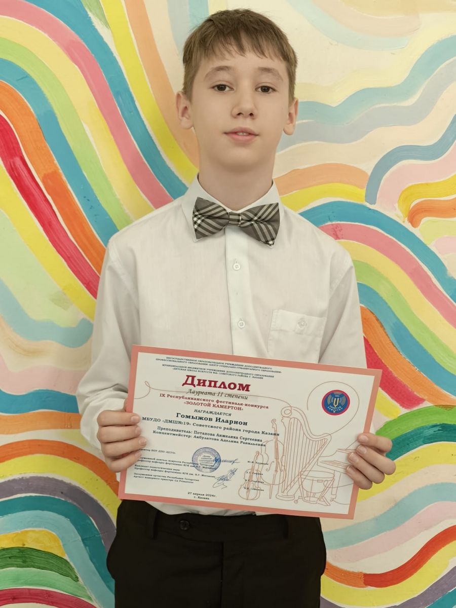 Поздравляем ученика 5Б класса Гомыжова Илариона с победой. Диплом Лауреата II степени IX республиканского фестиваля-конкурса "Золотой камертон ". Благодарим за подготовку педагога ДМШ №19 Потапову Анжелику Сергеевну и АкбулатовуАделину Равильевну. Желаем дальнейших успехов и творческих побед.
