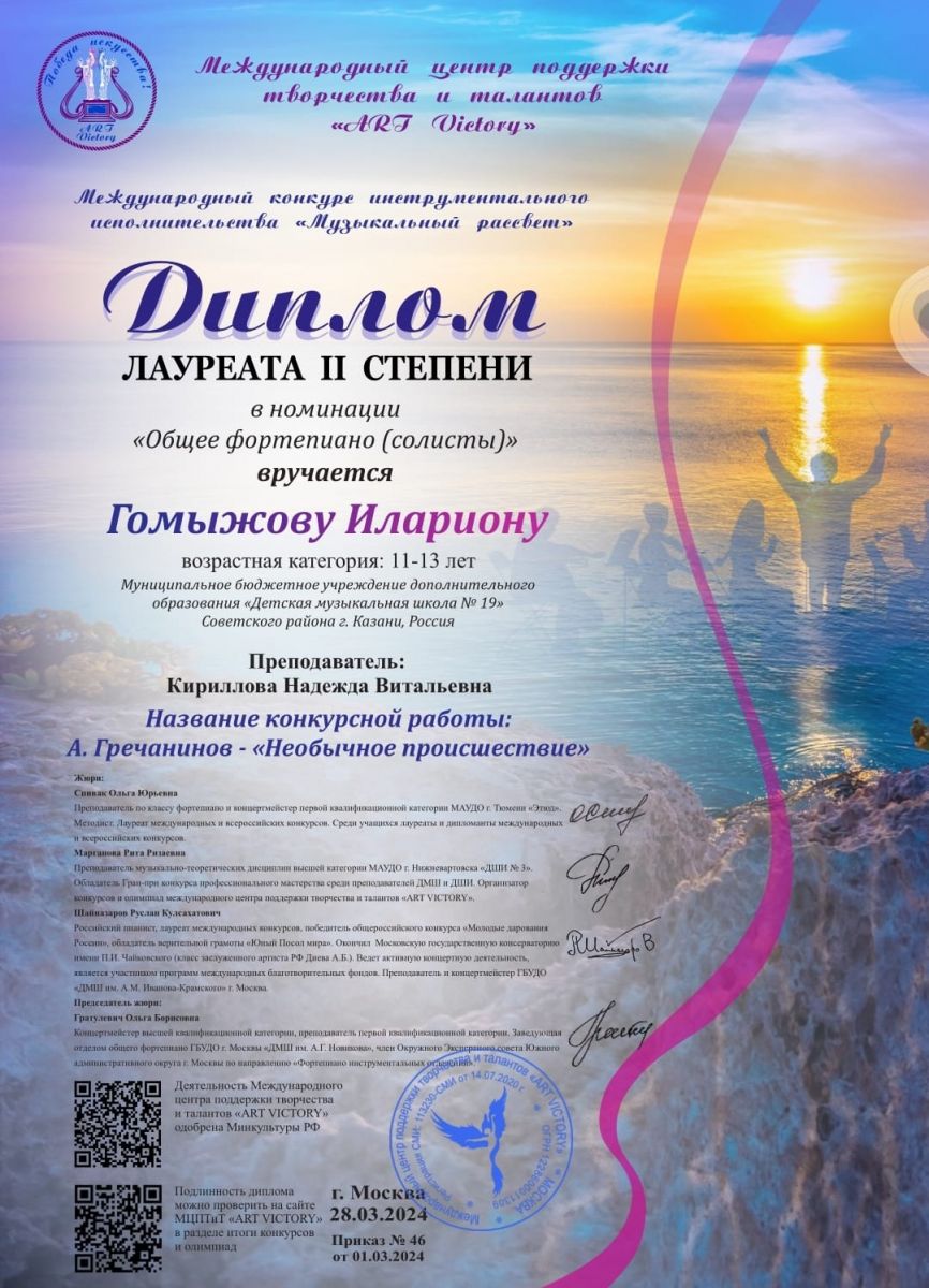 Поздравляем ученика 5Б класса, Гомыжова Иллариона с победой. Диплом Лауреата II степени в номинации общее фортепиано в Международном конкурсе инструментального исполнительства. Благодарим за подготовку педагога ДМШ №19 Кириллову Надежду Васильевну. Желаем дальнейших успехов и творческих побед.