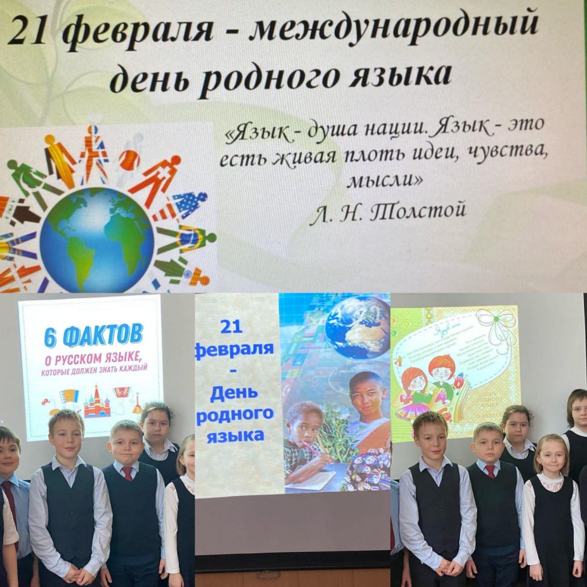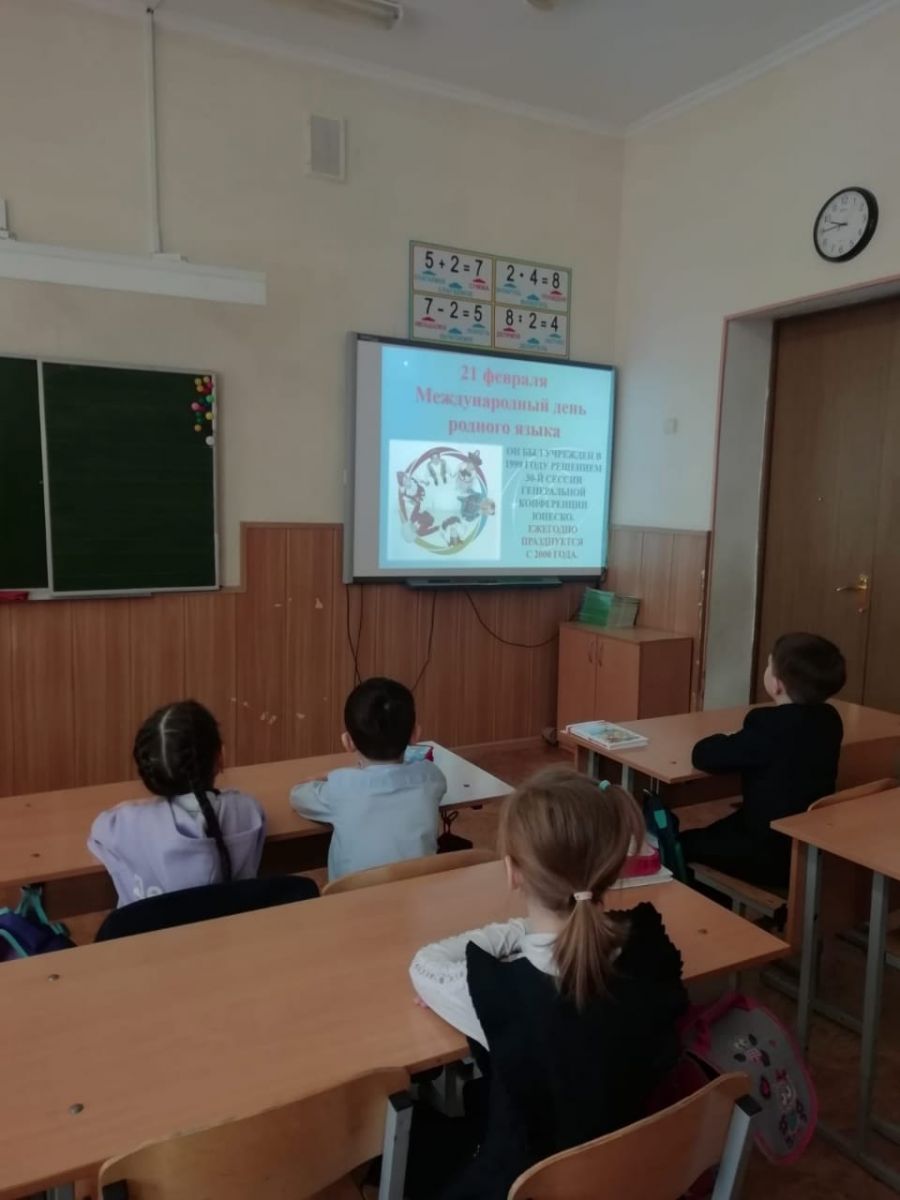 В 4 А класса учитель начальных классов, Курмаева Айгуль Рустамовна провела мероприятие на тему «Родной язык - душа народа». Учащиеся узнали об истории учреждения праздника «Международный день родного языка» в разных странах мира, обсудили, чем дорог каждому народу родной язык. Вспомнили, что в нашей Республике Татарстан для большинства населения родными являются русский и татарский языки.