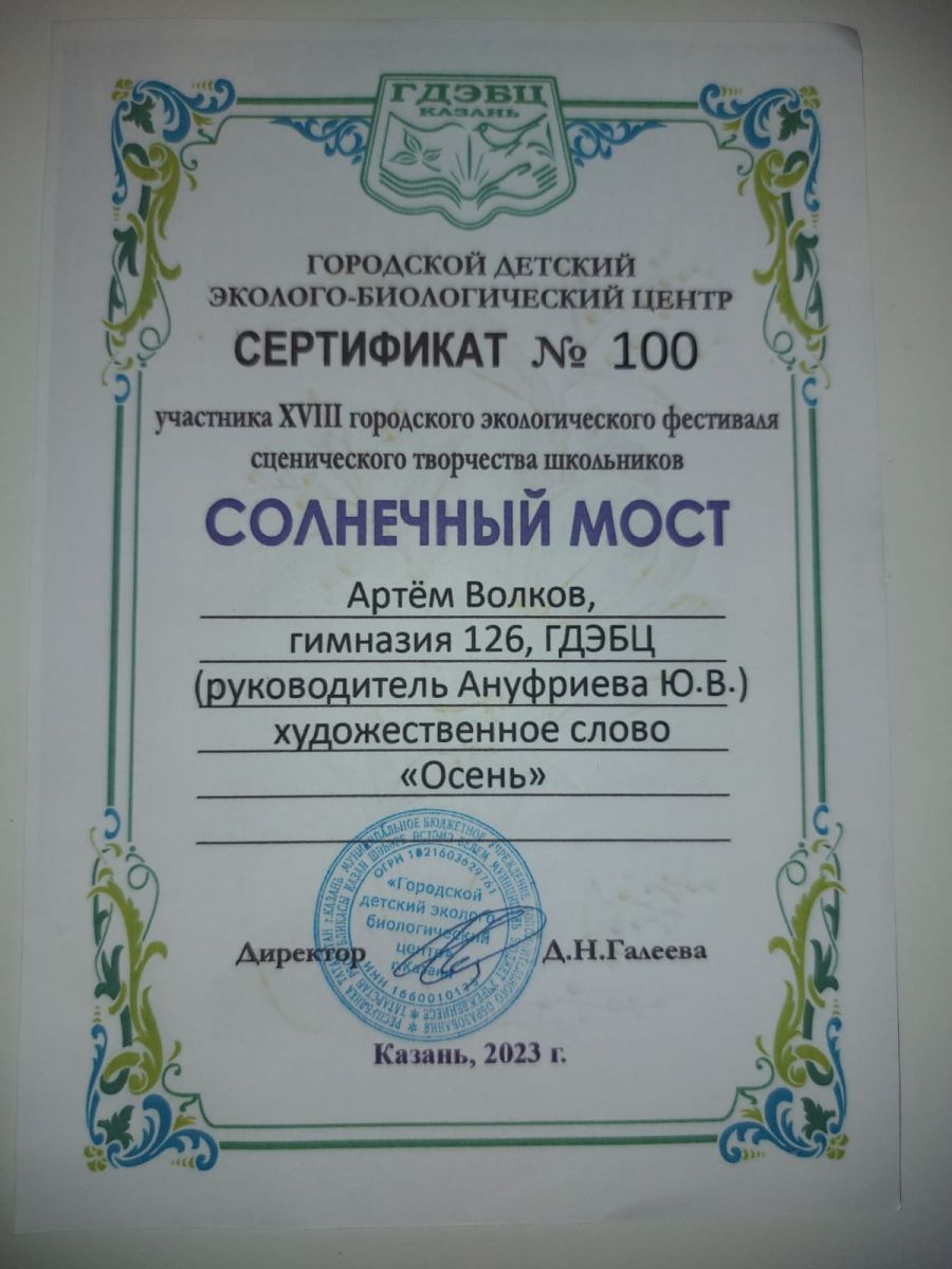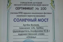Поздравляем ученика 4 Б класса, Волкова Артёма. Он участник XVIII городского экологического фестиваля "Солнечный мост". Благодарим за подготовку руководителя Ануфриеву Юлию Владимировну. Желаем дальнейших успехов и творческих побед.
