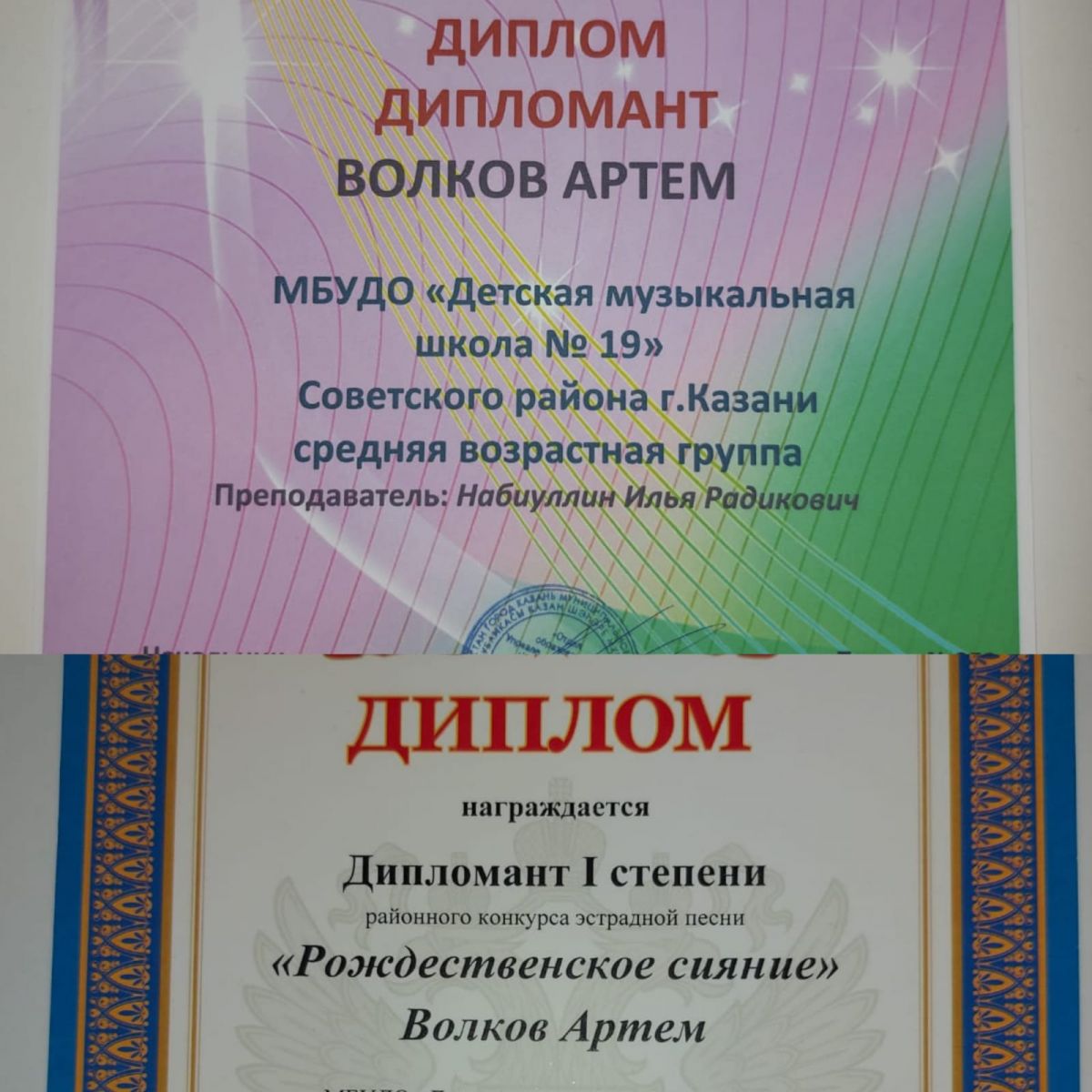 Поздравляем ученика 4Б класса, Волкова Артёма. Дипломант районного этапа городского конкурса "Юный вокалист". Дипломант I степени в районном конкурсе эстрадной песни "Рождественское сияние". Благодарим педагога МБУДО "ДМШ №19", Набиуллина Илью Радиковича. Желаем дальнейших успехов и творческих побед.