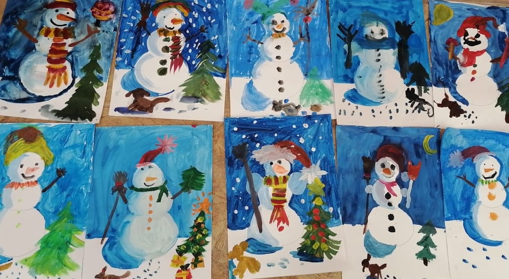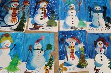 Зимой часто сыплет с неба в мокрый снег крупными хлопьями. Это значит время лепить снеговиков. Вот на занятиях art - студии первоклассников увлечённо принялись за снеговиков, но на бумаге.