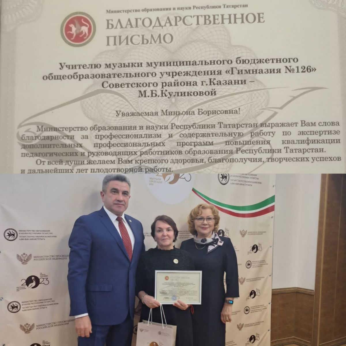 Поздравляем учителя музыки Куликову Миньону Борисовну. Благодарственное письмо за профессионализм и содержательную работу по экспертизе дополнительных профессиональных программ повышения квалификации педагогических и руководящих работников образования РТ. Желаем дальнейших успехов и творческих побед.