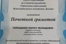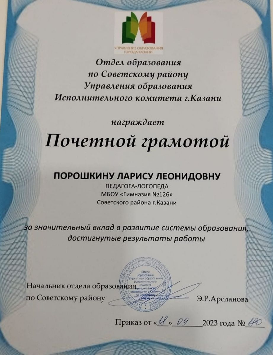 Поздравляем учителя-логопеда Порошкину Ларису Леонидовну! Награждена Почетной грамотой Отдела образования по Советскому району Управления образования Исполнительного комитета г. Казани за значительный вклад в развитие системы образования, достигнутые результаты работы. Желаем дальнейших успехов и новых высот.