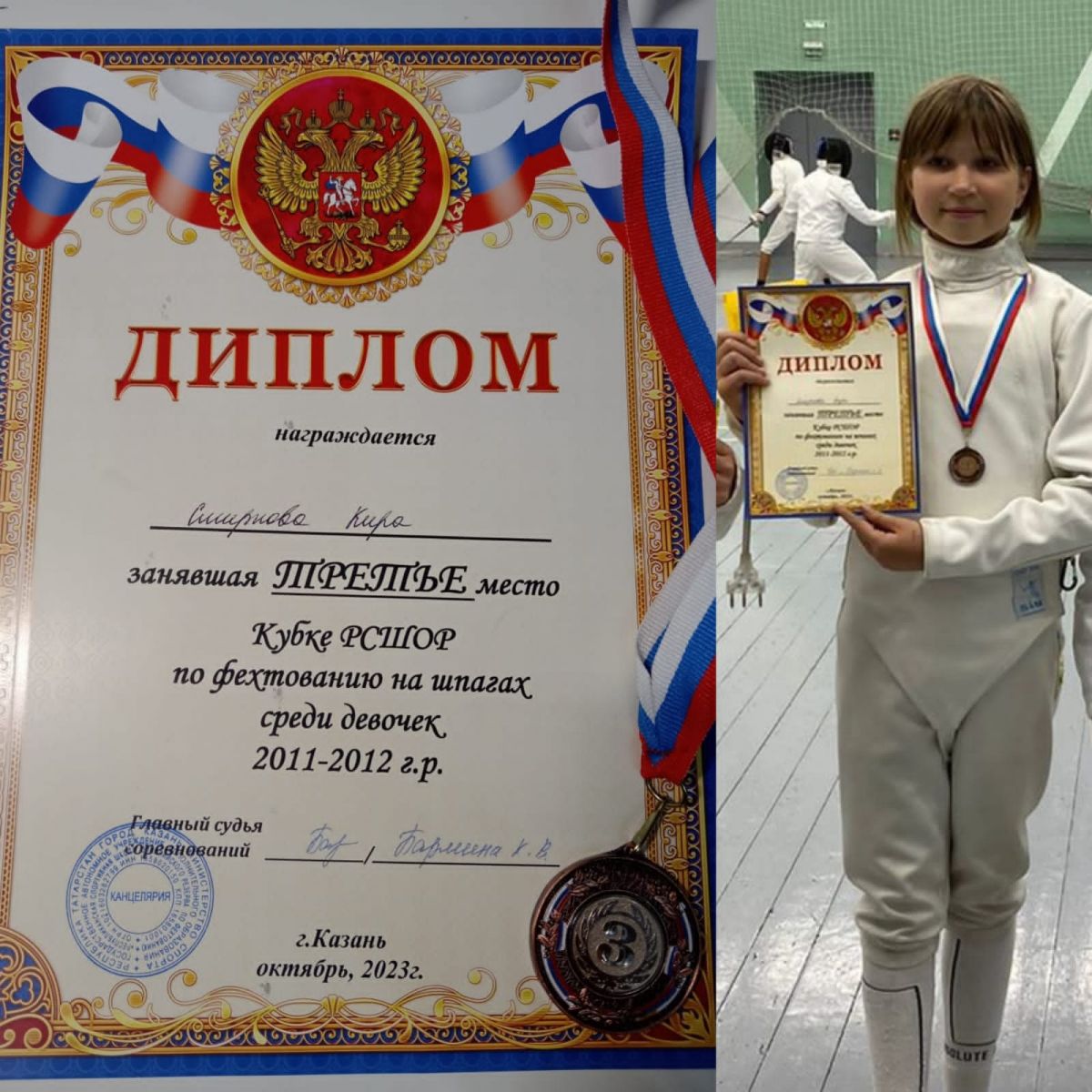 Поздравляем ученицу 5 Б класса Смирнову Киру. Она заняла III место на Кубке РСШОР по фехтованию на шпагах среди девочек, 2011-2012 г.р. Желаем дальнейших спортивных побед.
