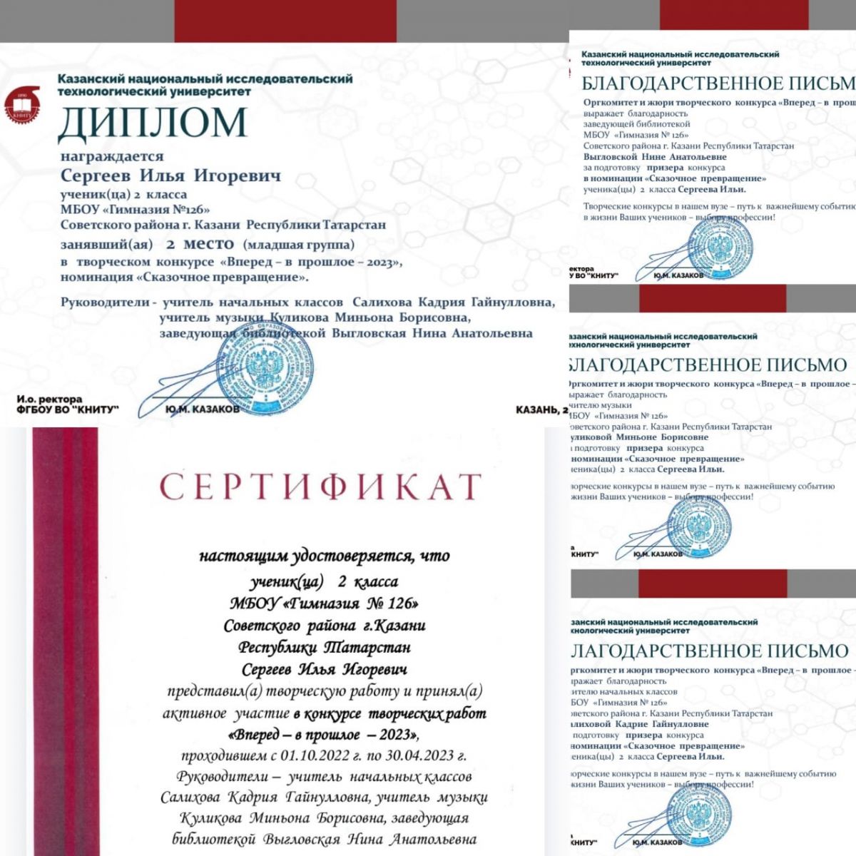 Поздравляем ученика 2 А класса Сергеева Илью с победой! Диплом II место за участие во Всероссийском творческом конкурсе "Вперед - в прошлое - 2023", номинация "Сказочное превращение". Благодарим за подготовку Салихову Кадрию Гайнулловну, учителя начальных классов, Выгловскую Нину Анатольевну, завбиблиотекой, Куликову Миньону Борисовну, учителя музыки. Желаем дальнейших успехов и творческих побед.