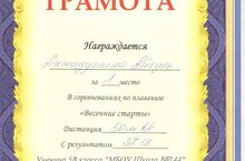 Ученица 5г класса МБОУ "Школа №144" Ахмадуллина Айгуль заняла 1 место в соревнованиях по плаванию "Весенние старты".