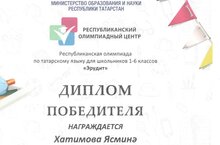 22 марта проводилась Республиканская олимпиада по татарскому языку для школьников 1-6 классов «Эрудит». Победителем стала Хатимова Ясмина, призерами стали Башарова Сарбиназ, Зиннатуллина Иллария, Хасанова Амина, сертификатами участника награждены Нуруллин Амир и Сиразов Тимур. Поздравляем!
