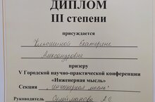 На состоявшейся 26 ноября V Городской научно-практической конференции "Инженерная мысль" были представлены творческие проекты наших учащихся Давыдова Владимира (11 класс) и Клюшиной Екатерины (10 класс). Среди многочисленных работ учащихся профильных школ, работы наших ребят были отмечены Дипломами призеров. Поздравляем с успешным выступлением на конференции. Желаем новых творческих поисков и побед.