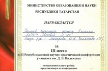 25 февраль көнне мәктәбебезнең 5в сыйныфы укучысы Галиев Искәндәр һәм 10б сыйныфы укучысы Гарифуллина Алсу Д.В. Вилькеев исемендәге укучыларның II Республика фәнни-гамәли конференциясендә катнашып III урыннарны яуладылар. Котлыйбыз! Җитәкчеләре: Макарова И.А., Җәләлиева Л.Р. һәм Корманова А.Ш. Киләчәктә дә уңышлар телибез!