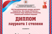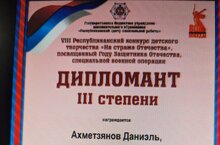 С 6 по 22 марта прошел VIII Республиканский конкурс детского творчества «На страже Отечества». Участвовал ученик 5 а класса нашей школы Ахметзянов Даниэль и стал Дипломантом III степени. Поздравляем!