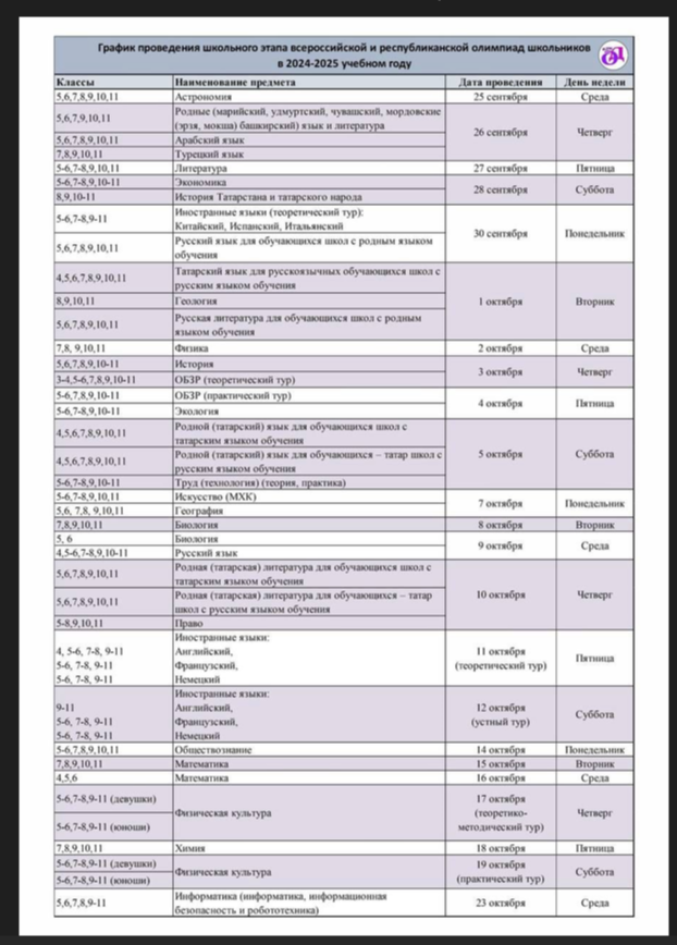 График проведения школьного этапа олимпиады в 2024-2025 учебном году