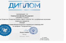 11 а сыйныфы укучысы Сәмигуллин Данияр КФУ төбәкара фән олимпиадаларының «татар теле» профиле буенча сайлап алу этабында призер булды. Данияр һәм укытучысы И. А. Макарованы котлыйбыз.