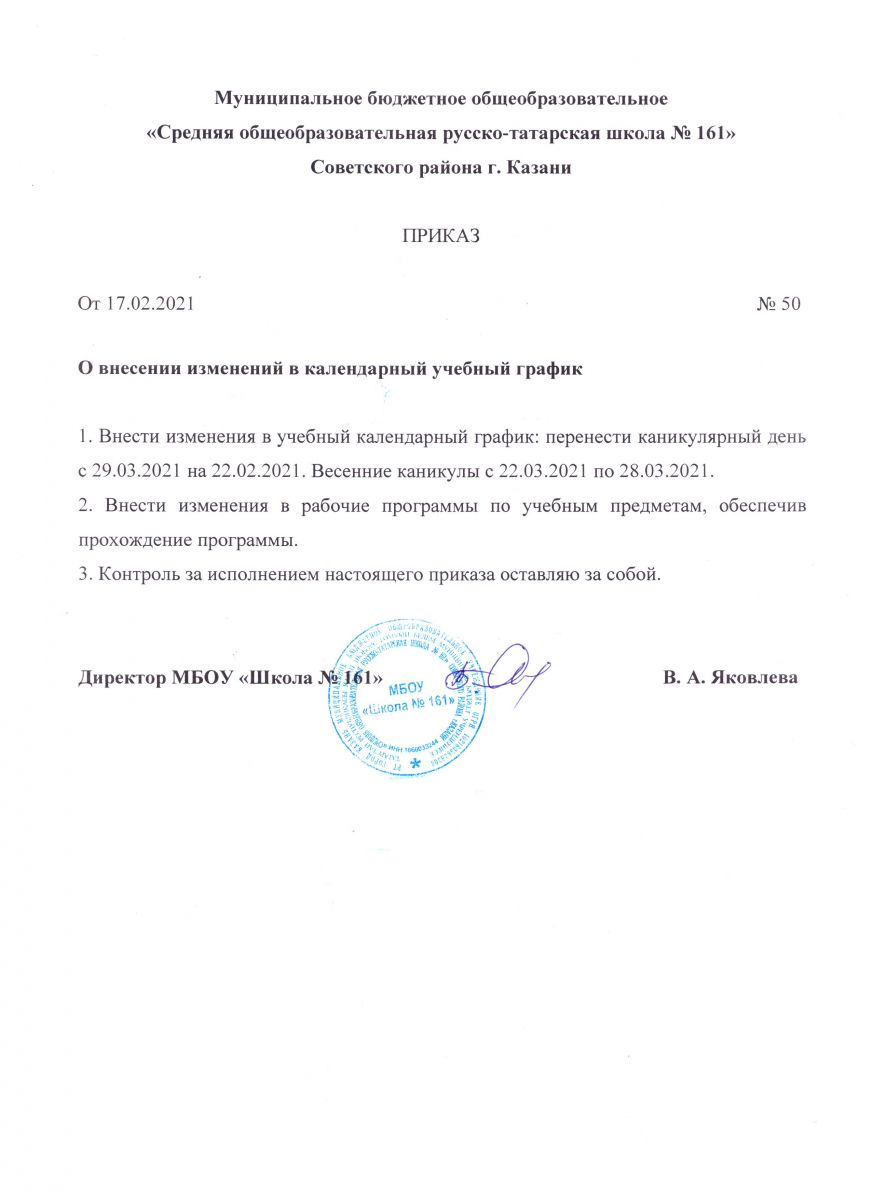 Приказ о внесении изменений в годовой календарный учебный график на 2020-2021 учебный год