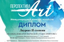 Ансамбль ложкарей творческой студии "Импульс" в составе учащихся 3Б класса принял участие в Международном конкурсе искусств "Перспектива Art". Выступив перед опытными членами жюри и продемонстрировав свои умения и навыки, а также свое мастерство, творческому коллектив удалось стать лауреатами II степени. Неоднократные победы коллектива дают мотивацию к самосовершенствованию, в этом им помогают руководители - Красильникова Е. Е. и Шаганова О. А. Молодцы!!!
