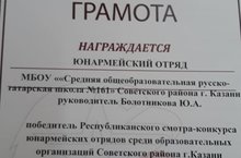 Юнармейский отряд школы в составе учеников 6В класса принимал участие в Республиканском смотре - конкурсе юнармейских отрядов среди образовательных организаций Советского района г. Казани. По результатам данного конкурса нашему отряду удалось завоевать звание победителя. Поздравляем юнармейцев и Болотникову Ю. А., классного руководителя 6В класса.