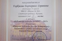 Поздравляем Горбунову Екатерину, ученицу 8Б класса, занявшую 2 место в конкурсе "Нобелевские надежды КНИТУ - 2017" в номинации "Языковая культура (русская литература)". Руководитель: Коровина М.Г.