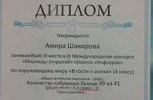 Амира заняла 3 место в III Международном конкурсе "Мириады открытий" проекта "Инфоурок". В стране Амира заняла 2 место! Очень высокий результат! Молодец! Выражаем благодарность Батыршиной М.Р. за подготовку талантливого ученика.