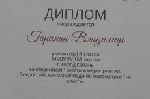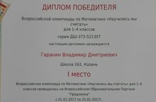 Поздравляем Гаранина Владимира, ученика 4А класса, ставшего победителем Всероссийской олимпиады по математике "Научились мы считать" для учеников 1-4 классов на Всероссийском образовательном портале "Продленка". Выражается благодарность педагогу: Батыршиной М.Р.