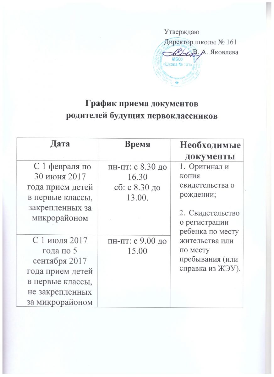 График приема документов родителей будущих первоклассников (2017-2018 уч.г.)