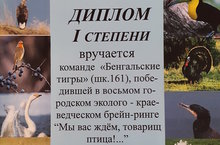 Команда юных экологов школы "Бенгальские тигры" (Ксения Кондратова, Динар Крымов и Руслан Шакиров) победили в восьмом городском эколого-краеведческомбрейн-ринге "Мы вас ждем, товарищ птица!..." Руководитель: Марфин В.Г.