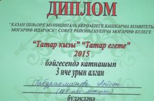 Районның “Татар кызы” бәйгесенең финалында катнашып, 3нче урынны яулаган 10а сыйныфы укучысы Габдрахманова Ләйсәнне котлыйбыз. Ләйсән үзенең моңлы тавышы белән бөтен тамашачыларның күңелен җәлеп итте. Ләйсәннең киләчәктә тагы да зуррак уңышларга ирешүен, зур үрләр яулавын телибез.