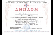 Дипломом за 1 место награждается Ибнеев Азат в открытом Чемпионате и Первенстве России по кекусин каратэ (кумитэ), в возрастной группе 16-17 лет.