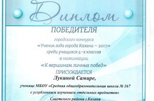 Поздравляем ученицу 4 Д класса Лукину Самиру с победой в городском конкурсе "Ученик года 2017" в номинации "К вершинам личных побед"
