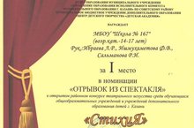 Ученик нашей школы Хайдаров А. награжден дипломом за победу в номинации "Лучший актер" в открытом районном конкурсе театрального искусства среди обучающихся ОУ и УДО г.Казани. ПОЗДРАВЛЯЕМ!