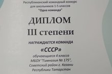 Поздравляем команду учащихся 4 "г" класса, ставшую призером Республиканского конкурса "ОДНА КОМАНДА". Поздравляем Зинатуллину Самиру, Файзуллину Алину, Ахмедову Нигину, Хайруллина Амира, Хабибуллина Ратмира . Так держать! В командной работе наш успех!