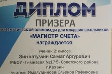 Поздравляем Зинатуллина Самата ученика 2г класса, ставшего призером городской олимпиады по математике "Магистр счета". Желаем Самату покорить новые вершины в его любимой науке - математике!
