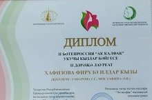 Мәктәбебезнең 9 нчы сыйныф укучысы Хафизова Фирүзә «Бөтендөнья татар конгрессы» Регионара иҗтимагый оешмасы, «Ак калфак» Регионара татар хатын-кызлары иҗтимагый оешмасы, Казан шәһәренең мәгариф идарәсе, ТР Язучылар берлегеннән торган комитет оештырган «АК КАЛФАК» II БӨТЕНРОССИЯ УКУЧЫ КЫЗЛАР БӘЙГЕСЕндә катнашты. Төрле этапларны үтеп, Фирүзә үзенең чын татар кызы булуын исбатлады.Укучы кызыбыз кыйммәтле бүләкләр һәм II дәрәҗә диплом белән бүләкләнде. Әфәрин! Бәйгене әзерләүдә катнашкан туган тел һәм әдәбияты укытучылары Гафарова Гөлнара Галимхан кызына, Мустафина Әлфия Вахит кызына рәхмәтебезне белдерәбез!