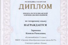 3 нче февраль көнне 11 нче сыйныф укучысы Зарипова Камилә һәм 5 нче сыйныф укучысы Мифтахова Адилә татар теленнән Республика күләмендә үткәрелгән олимпиадада катнашып, призер булдылар.Кызларны һәм аларның җитәкчеләрен (Зарипова А.Ә, Габделвәлиева Р.Н.) җиңүләре белән чын күңелдән котлыйбыз! Әфәрин, кызлар! Киләчәктә дә яңа үрләр,уңышлар сезгә!