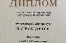 Республика күләмендә үткәрелгән татар әдәбияты олимпиадасының соңгы этабында 11 нче сыйныф укучысы Зарипова Камилә призер булды. Укучыбызны һәм аны әзерләгән туган тел укытучысы Алинә Әнис кызын зур җиңүләре белән ихлас котлыйбыз! Әфәрин, горурланабыз! Киләчәктә дә уңышлар һәм яңадан-яңа үрләр телибез.