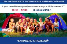 В соответствии с планом работы Министерства образования и науки Респуб-лики Татарстан 8 июня 2018 года в 10:30 состоится заседание Республиканского родительского интернет-собрания на тему: «Каникулы с пользой».