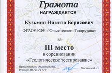 Поздравляем Кузьмина Никиту, ученика 8в класса, занявшего 3 место в XI Всероссийской открытой геологической олимпиаде «Земля и человек» в г. Москва. Никита стал призером в соревновании «Геологическое тестирование». Так держать!