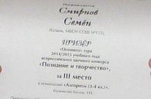 Поздравляем ученика 3 Б класса Смирнова Семена с победой во Всероссийском конкурсе "Алгоритм". Семен, мы гордимся тобой! Ты достойно выдержал конкуренцию среди тысячи девчонок и мальчишек со всей России! Желаем тебе творческого вдохновения и дальнейших побед!