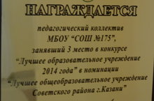 27 августа прошла августовская конференция работников образования, финалом которой стало подведение итогов районного конкурса "Лучшее образовательное учреждение 2014 года". По итогам 2013-2014 учебного года наша школа заняла 3 место в районном конкурсе "Лучшее образовательное учреждение 2014 года", а также вошла в рейтинг "100 лучших школ Республики Татарстан".