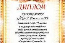 Сегодня, 25 марта 2013 года, команда школы №175 успешно выступила в турнире по волейболу среди команд преподавателей общеобразовательных учреждений Советского района г. Казани в рамках Спартакиады «Спортивная Казань-2013» и заняла 3 место. Поздравляем!