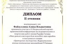 Ученица 8Г класса Файзуллина Алина приняла участие во Всероссийской научно-практической конференции исследовательских и творческих работ имени Радифа Гаташа «Мин доньяга хислэрем хэм мэхэбэт Аша карыйм» и выступила с докладом в секции «Ораторское мастерство. Выразительное чтение поэтических произведений». Алина награждена дипломом 2 степени! Поздравляем Алину с победой и желаем дальнейших успехов!