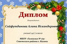 Поздравляем учащихся 7а класса Мухетдинова Марселя и Сайфутдинову Алину, ставших призерами Всероссийского конкурса поделок и ёлочных игрушек "Новогодняя мастерская" в номинации "Новогодняя игрушка" и "Символ года". Молодцы! Желаем дальнейших творческих успехов!