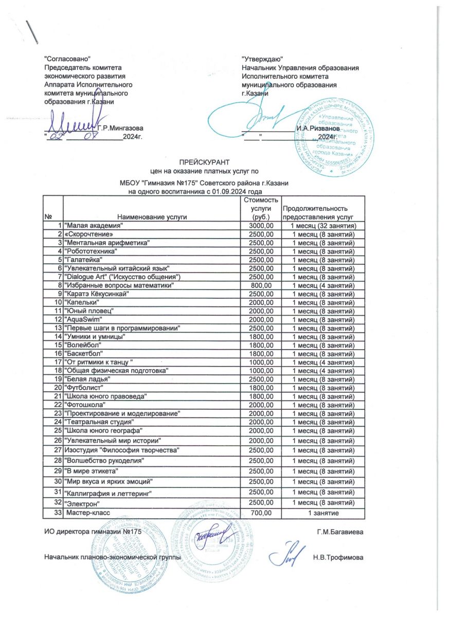 Прейскурант цен на оказание платных образовательных услуг 2024 - 2025 учебный год